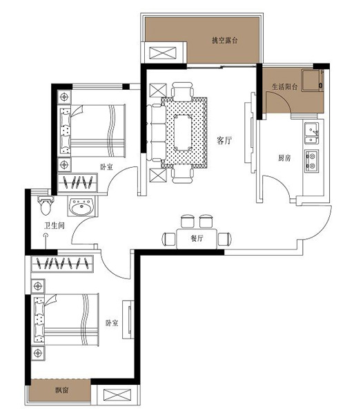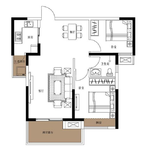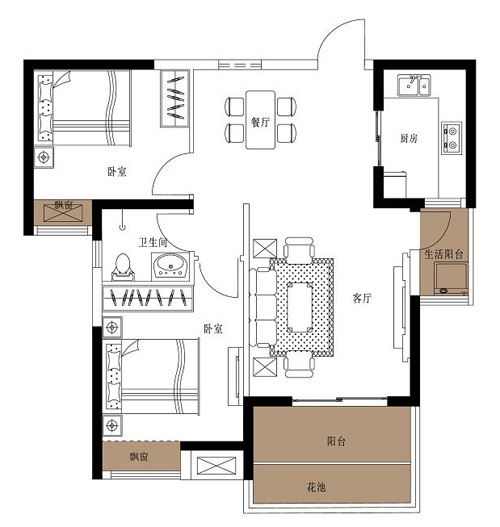 户型名称:B2户型 户型结构:两室两厅 户型面积:89 平方米