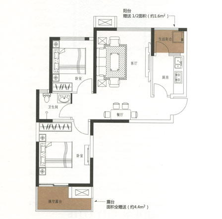 户型名称:A2户型 户型结构:两室两厅 户型面积:78 平方米