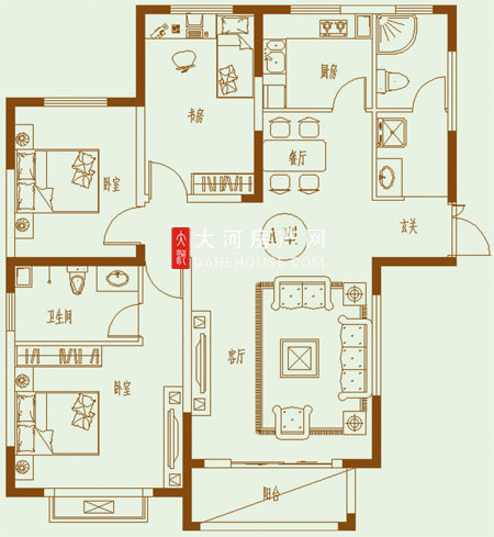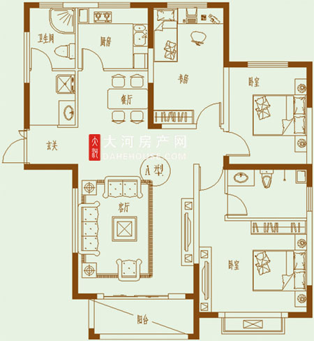 户型名称:A户型 户型结构:三室两厅两卫 户型面积:125.35 平方米