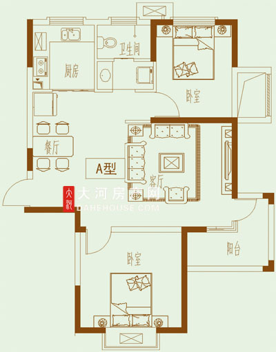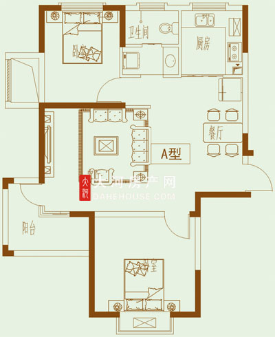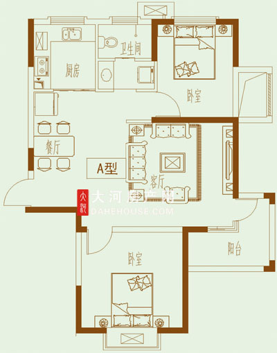 户型名称:3A户型 户型结构:两室两厅一卫 户型面积:85.98 平方米