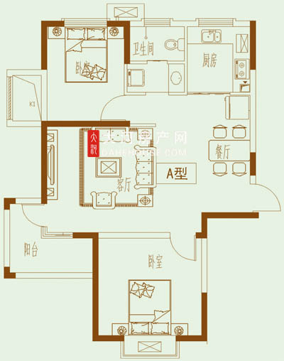 户型名称:3A户型反 户型结构:两室两厅一卫 户型面积:85.98 平方米