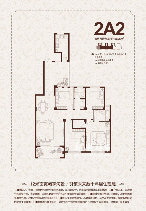 户型名称:双河湾二期2A2户型 户型结构:4室2厅2卫 户型面积:159.75㎡ 平方米