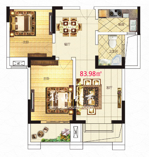 户型名称: 户型结构:两室两厅一卫一厨 户型面积:83.36 平方米
