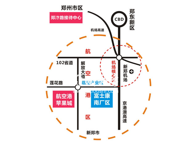 除了产品优势外,航空港.苹果城更具有得天独厚的区位投资优势。项目位居航空港南区桥头堡要位,得天时地利人和。2010年10月24日,国务院正式批准设立郑州新郑综合保税区(郑州航空港区);航空港区东临国际机场,北距郑州市区20公里,是围绕郑州新郑国际机场开发建设起来的一个重要的经济发展区域,郑州航空港区是目前中国所有对外开放区域中层次最高、政策最优惠、功能最齐全的海关特殊监管区域,必将引领全新的投资热潮。
