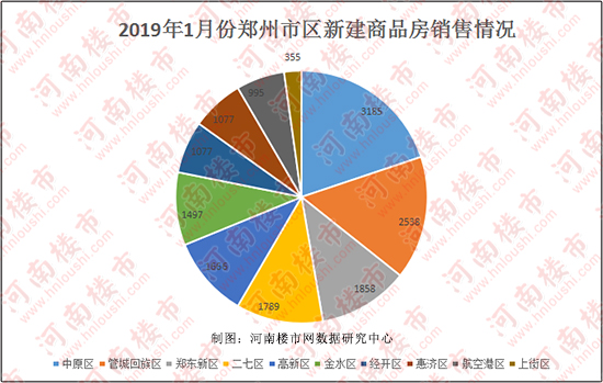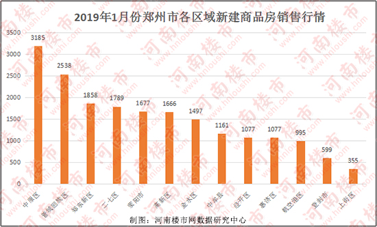 据河南楼市网数据研究中心统计,2019年1月份,郑州市区新建商品房共计销售16037套,其中销售量超过1500套的区共计5个,分别为中原区(3185套)、管城区(2538套)、郑东新区(1858套)、二七区(1789套)、高新区(1666套)。