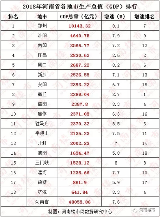 2018年河南省各地市GDP排行出炉
