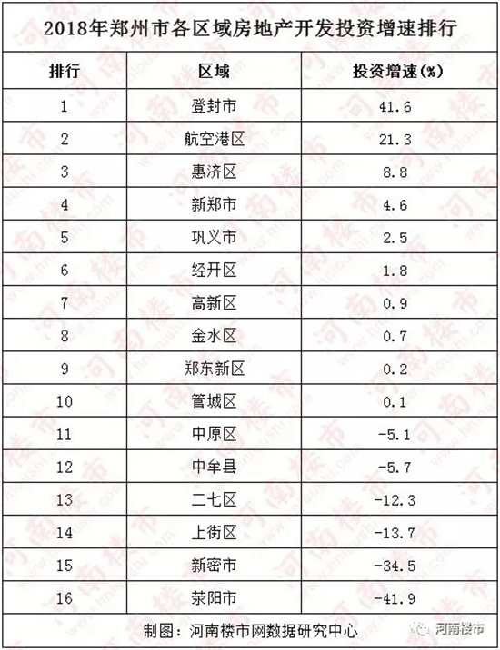 分区域来看,登封市2018年房地产开发投资增速最高,达到41.6%,航空港区以21.3%的增速位居第二位;2018年郑州全市共有10个区域的房地产开发投资同比上年有所增加,6个区域同比上年有所下降,其中荥阳市降幅最大,达到41.9个百分点!