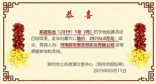 该地块被郑州亚新房地产开发有限公司以起始价29700万元摘得,折合楼面价2576元/㎡。
