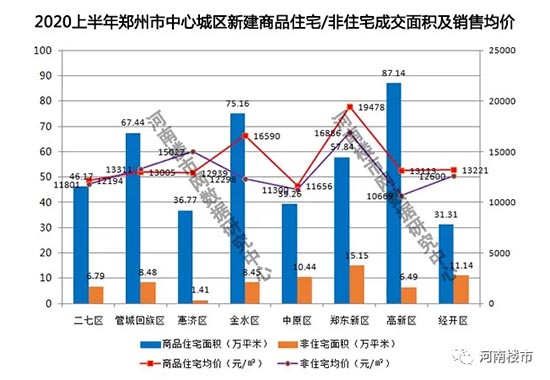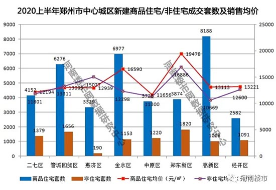 2020上半年郑州市中心城区新建商品住宅销售均价为14329元/㎡,非住宅销售均价为11820元/㎡。