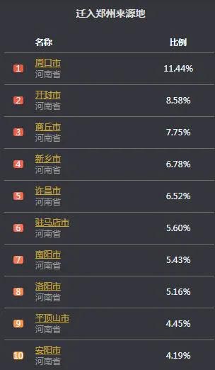 数据显示,迁入郑州前10名城市均为河南省内城市,其中周口排名第一,占据总入郑人数的11.44%,如果按2019年新增的21.6万人计,仅周口就迁入了2.47万人,开封、商丘、新乡、许昌分别以8.58%、7.75%、6.78%、6.52%的迁入比例占据前五的位置。