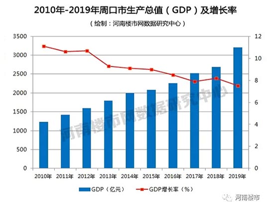 近年来,周口市经济发展健康平稳,人民安居乐业,幸福指数不断攀升,GDP逐年增长,GDP增长率保持在8%以上的快速发展水平;2019年全市GDP达3198.49亿元,增长率为7.5%。