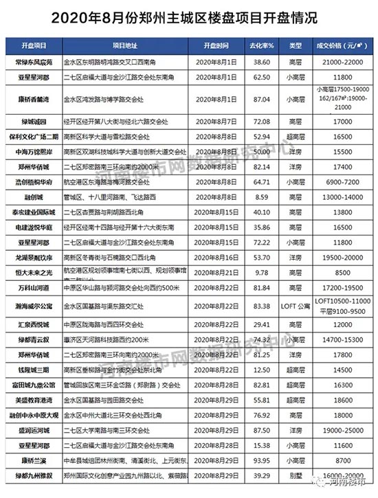 2020年8月份,郑州主城区开盘项目有27个(次),推出房源共计4128套,开盘当天成交2550套,整体去化率仅为61.77%,但略高于上个月的开盘去化率。