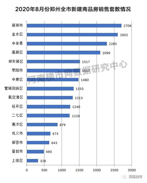 2020年8月份,在全市新建商品房销售中,新郑市表现较好,以销量约2706套位居全市之首,金水区以2602套位居第二,中牟县以2285套位居第三。上街区、登封市、新密市销量垫底后三。