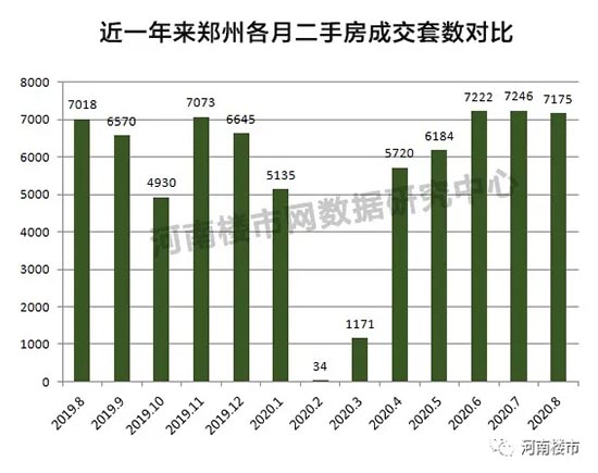2020年8月份,郑州全市二手房成交约7175套,与上月基本持平,略高于去年8月份。