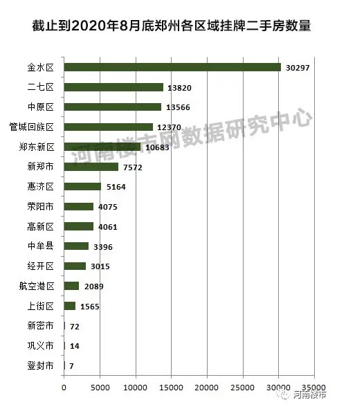 据链家网显示,截止到2020年8月底,郑州全市挂牌二手房达到111750套,比上月略有增加,其中金水区挂牌二手房数量最多,约30300套;二七区、中原区、郑东新区、管城区等区域挂牌二手房数量均破万套。