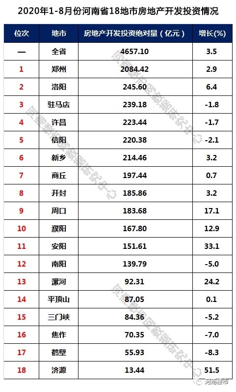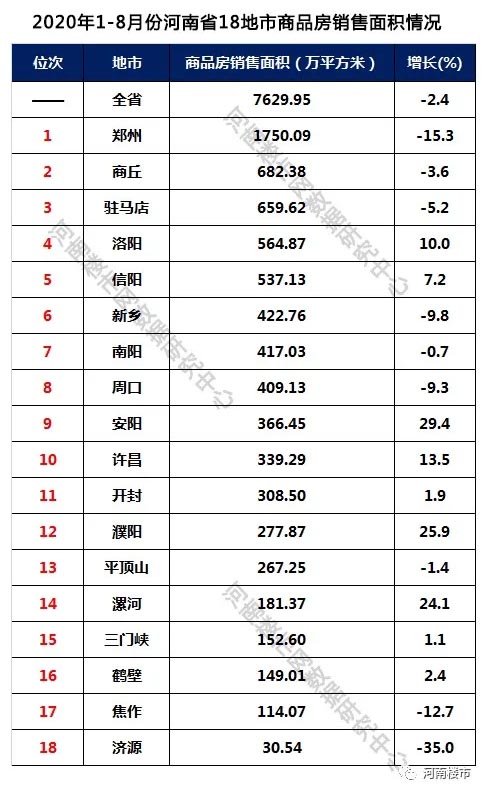 郑州、商丘、驻马店、洛阳、信阳分居2020年1-8月份商品房销售前五名,济源、焦作、鹤壁、三门峡、漯河位居后五位;其中安阳、濮阳、漯河增速加大,均达到20%以上,济源、郑州、焦作呈现严重的负增长,下降幅度达到10%以上,其中济源下降幅度大35%,郑州下降幅度大15%。