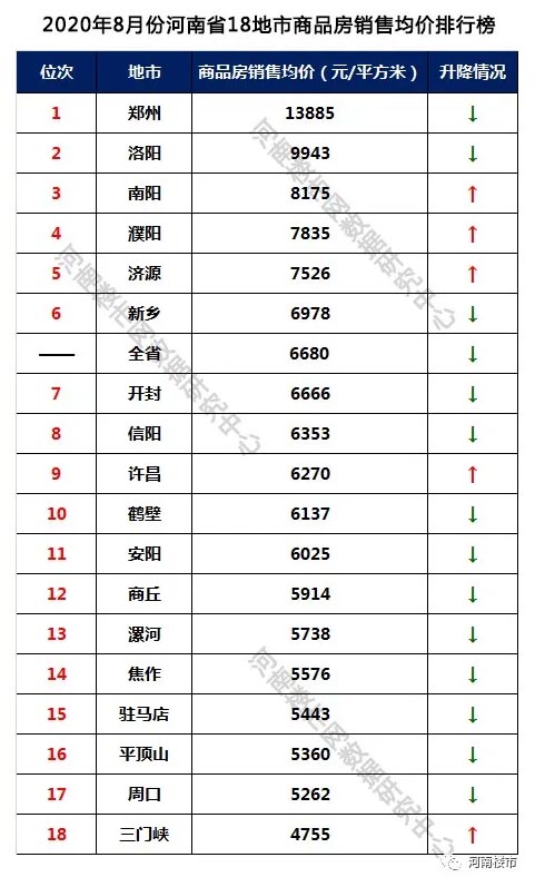 2020年8月份,河南省18地市中省会郑州以13885元/平米的销售均价位居全省第一,其次是洛阳、南阳、濮阳、济源等分居销售均价前五;三门峡、周口、平顶山等地市销售均价居后,甚至低于省内某些县城房子的销售均价。
