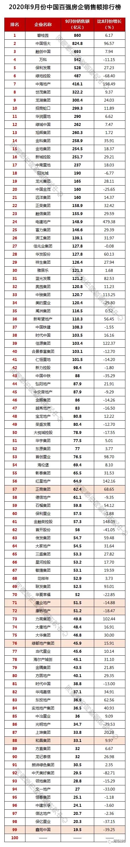 9月份全国百强房企销售业绩排行榜