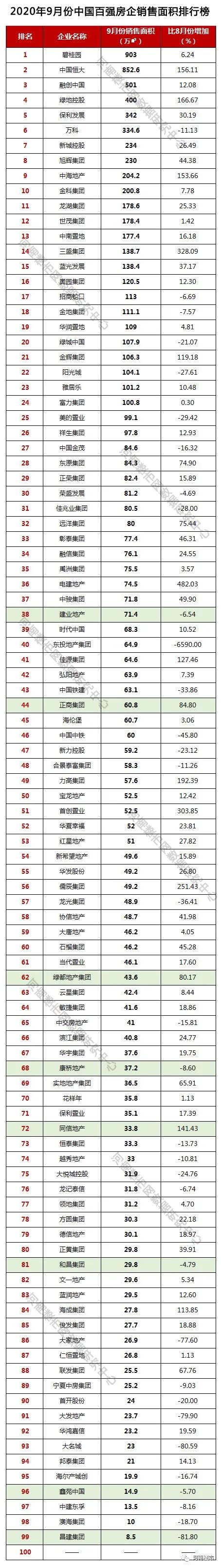 绿地集团实现销售面积400万平米,比上月增长166.67%,位居2020年9月全国百强房企销售面积排行榜第四名;