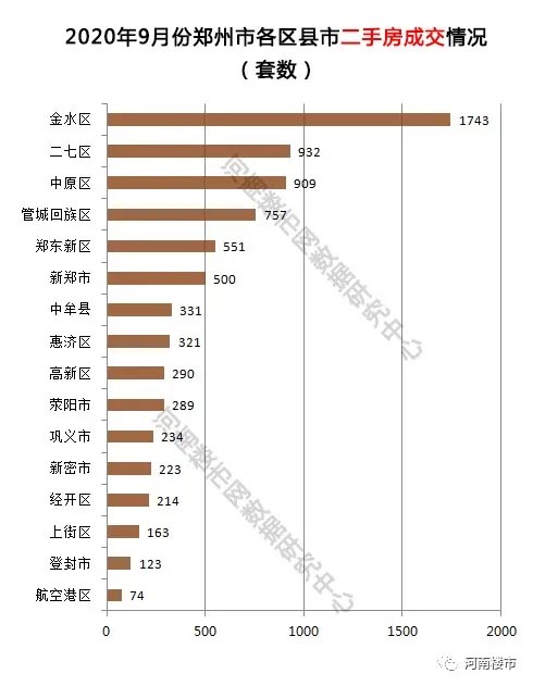 2020年9月份,郑州全市二手房成交7654套,几乎与8月份持平。其中金水区以1743套的成交量再次位居全市第一名;二七区以932套位居全市第二;中原区以909套位居第三。
