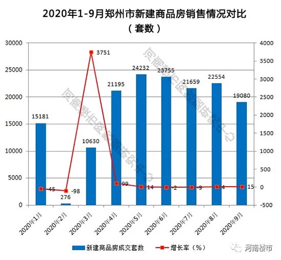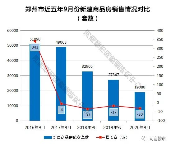 据统计,2020年9月份,郑州全市商品房销售19080套(间),较去年同期下降了30.23%;商品房销售面积209.11万平方米,较去年同期下降了23.31%。其中商品住宅销售15501套,较去年同期下降了18.01%;商品住宅销售面积185.12万平方米,较去年同期下降了14.02%。