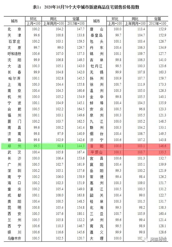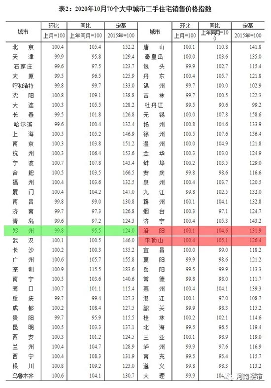 从上表《2020年10月份70个大中城市新建商品住宅销售价格指数》中可以看到,10月份有18个城市新建商品住宅销售价格环比下降,其中郑州位居其中,环比下降0.5%;有10个城市新建商品住宅销售价格同比下降,其中郑州位居其中,同比下降1.2%。