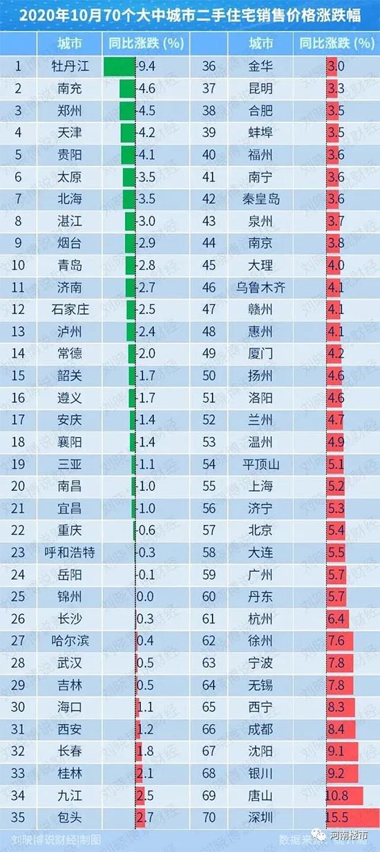 从上表《2020年10月份70个大中城市二手住宅销售价格指数》中可以看到,10月份有27个城市二手住宅销售价格环比下降,其中郑州位居其中,环比下降0.2%;有24个城市二手住宅销售价格同比下降,其中郑州位居其中,同比下降4.5%,降幅在70个大中城市中位居第三,仅次于牡丹江和南充!
