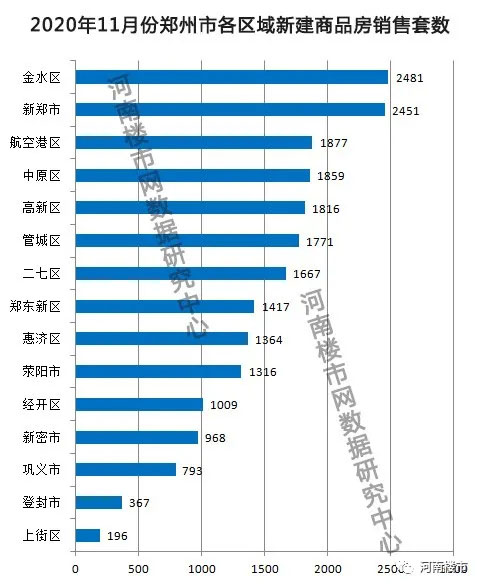 11月份郑州市各行政区域新建商品房销售量参差不齐,相差较大,其中金水区销售2481套,从上个月的第三名跃升到11月份的第一名;新郑市以2451套的销售业绩屈居第二名,自今年3月份以来销售套数连续“八连冠”的战绩11月份被金水区终结。航空港区突飞猛进,11月份以成交1877套位列第三名。上街区、登封市、巩义市位居后三位。