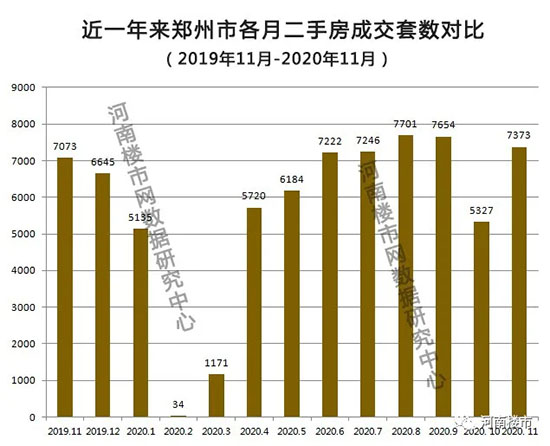 2020年11月份,郑州全市二手房交易成交7373套,同比增长4.24%,环比增长38.4%。