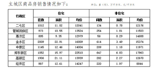 郑州全市商品房销售22554套(间),销售面积248.59万平方米,销售均价12072元/平方米;其中商品住宅销售18255套,销售面积216.07万平方米,销售均价12119元/平方米。非住宅销售4299套(间),非住宅销售面积32.52万平方米,非住宅销售均价为11761元/平方米。