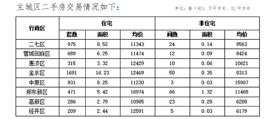 郑州全市二手房共成交7701套(间),成交面积76.86万平方米,成交均价10581元/平方米;其中住宅二手房共成交7488套,成交面积74.43万平方米,成交均价10602元/平方米。(备注:二手房均价是以评估指导价为计算依据)