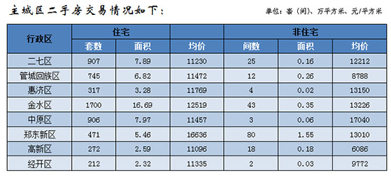 郑州全市二手房共成交7654套(间),成交面积77.13万平方米,成交均价10636元/平方米;其中住宅二手房共成交7432套,成交面积74.09万平方米,成交均价10602元/平方米。(备注:二手房均价是以评估指导价为计算依据)