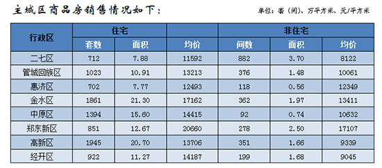 郑州全市商品房销售22082套(间),销售面积233.83万平方米,销售均价11506元/平方米;其中商品住宅销售18133套,销售面积209.36万平方米,销售均价11709元/平方米。非住宅销售3949套(间),非住宅销售面积24.46万平方米,非住宅销售均价为9766元/平方米。