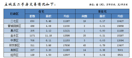 郑州全市二手房共成交5327套(间),成交面积53.02万平方米,成交均价10656元/平方米;其中住宅二手房共成交5199套,成交面积51.23万平方米,成交均价10646元/平方米。(备注:二手房均价是以评估指导价为计算依据)