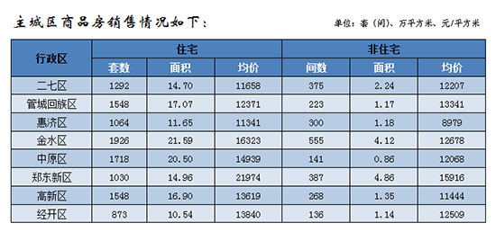 郑州全市商品房销售22969套(间),销售面积250.17万平方米,销售均价11737元/平方米;其中商品住宅销售19076套,销售面积221.48万平方米,销售均价11834元/平方米。非住宅销售3893套(间),非住宅销售面积28.69万平方米,非住宅销售均价为10988元/平方米。