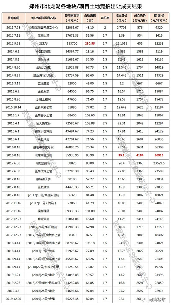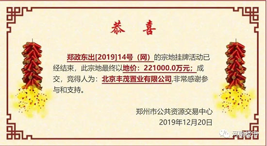 2019年12月20日,金茂旗下北京丰茂置业有限公司以总价22.1亿元,单价2668万元/亩,折合楼面价23529元/平,摘得郑政东出[2019]14号地。从此北龙湖南岸片区土地尘封,土拍大战消停。