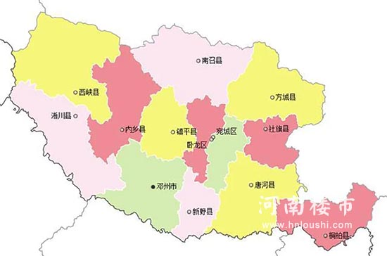 (3)南阳市辖原南阳地区的桐柏县、方城县、淅川县、镇平县、唐河县、南召县、内乡县、新野县、社旗县、西峡县和新设的宛城区、卧龙区。原南阳地区的邓州市由省直辖。