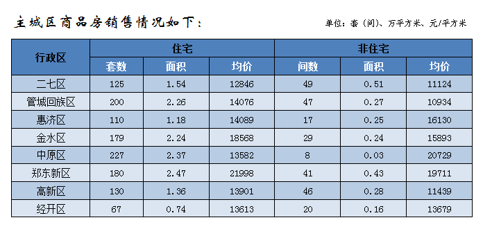 郑州全市商品房销售5458套(间),销售面积60万平方米,销售均价9996元/平方米;其中商品住宅销售4717套,销售面积53.61万平方米,销售均价10020元/平方米。非住宅销售741套(间),非住宅销售面积6.39万平方米,非住宅销售均价为9800元/平方米。