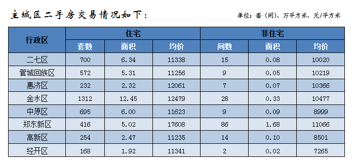 郑州全市二手房共成交5829套(间),成交面积58.94万平方米,成交均价10943元/平方米;其中住宅二手房共成交5643套,成交面积56.37万平方米,成交均价10963元/平方米。(备注:二手房均价是以评估指导价为计算依据)