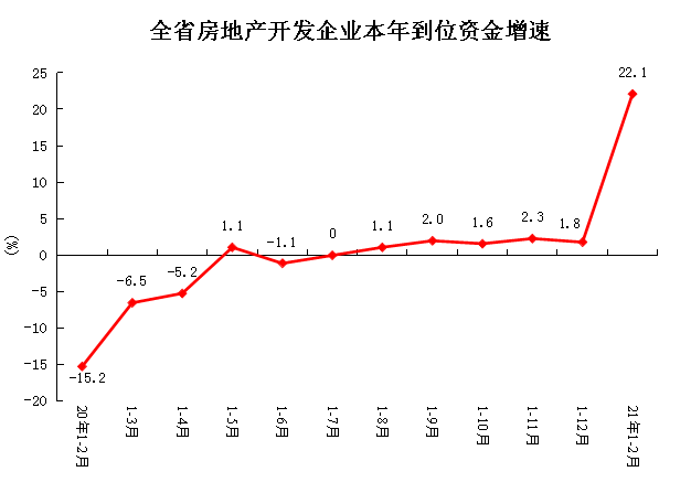 1-2月,房地产开发企业实际到位资金877.17亿元,同比增长22.1%。其中,国内贷款90.50亿元,下降8.1%;自筹资金403.64亿元,增长3.0%;定金及预收款224.31亿元,增长62.4%;个人按揭贷款144.84亿元,增长76.2%。