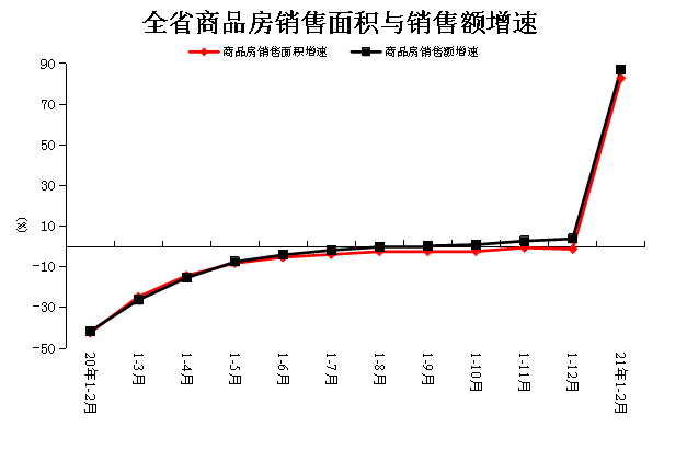 1-2月,商品房销售面积899.37万平方米,同比增长72.8%。其中,住宅销售面积增长72.6%,办公楼销售面积增长12.8%,商业营业用房销售面积增长81.9%。商品房销售额592.46亿元,增长77.7%。其中,住宅销售额增长77.2%,办公楼销售额增长30.2%,商业营业用房销售额增长93.8%。