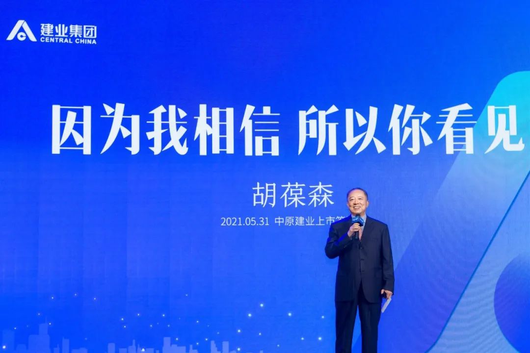 其次是感恩。感恩伟大的时代,使建业六年前立下的目标得以实现。胡董以《因为我相信,所以你看见》为题,回顾了2015年6月6日在建业新蓝海战略发布会上所做的分享,六年前所说的“发挥企业战略优势、品牌优势和资源叠加优势,以分享为指导思想,以轻资产为主要模式,用三至五年时间,构建大建业商业生态系统,实现企业从房地产开发商至新型生活方式服务商的整体转型”,随着今日中原建业鸣锣上市,变成了现实。