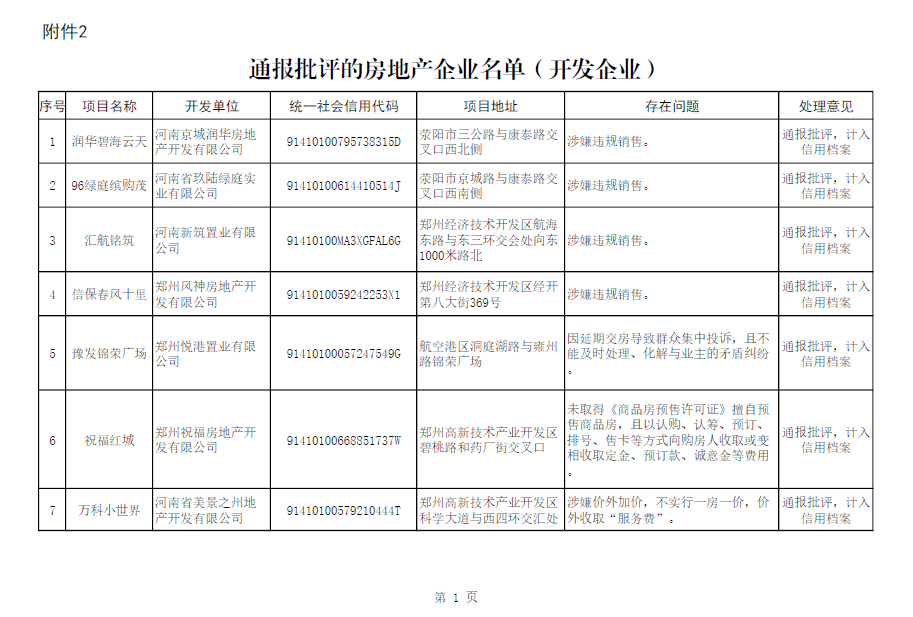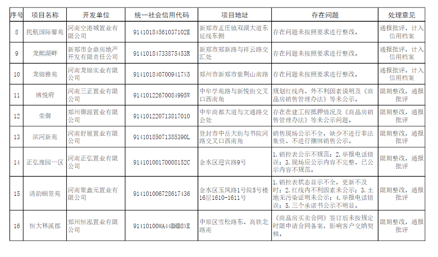 一是河南京城润华房地产开发有限公司开发的润华碧海云天项目,河南省玖陆绿庭实业有限公司开发的96绿庭缤购茂项目、河南新筑置业有限公司开发的汇航铭筑项目、郑州风神房地产开发有限公司开发的信保春风十里项目等涉嫌违规销售;郑州悦港置业有限公司开发的豫发锦荣广场延期交房等问题,导致群众集中投诉,且未能及时处理、化解与业主的矛盾纠纷;郑州祝福房地产开发有限公司开发的祝福红城项目未取得《商品房预售许可证》擅自预售商品房,且以认购、认筹、预订、排号、售卡等方式向购房人收取或变相收取定金、预订款、诚意金等费用;河南省美景之州地产开发有限公司开发的万科小世界项目涉嫌价外加价,不实行一房一价,价外收取‘服务费’。