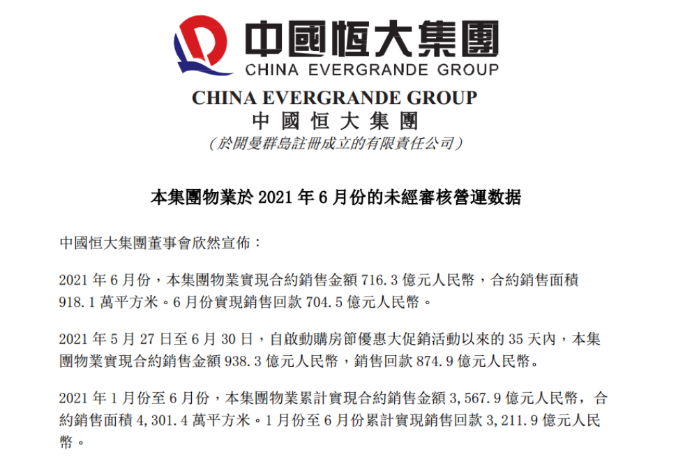 7月1日,中国恒大发布公告,自启动购房节优惠大促销活动以来,从5月27日至6月30日35天内,恒大实现合约销售938.3亿元,销售回款874.9亿元,其中6月单月销售716.3亿元。