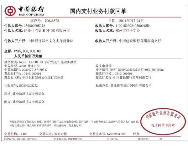 建业集团向郑州市红十字会捐赠现金500万元设立“建业防汛抗灾专项基金”,并同时采购救援物资支持受灾地区与群众。
