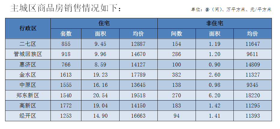 郑州全市商品房销售18754套(间),销售面积215.51万平方米,销售均价12756元/平方米;其中商品住宅销售16473套,销售面积191.93万平方米,销售均价12885元/平方米。非住宅销售2281套(间),非住宅销售面积23.58万平方米,非住宅销售均价为11705元/平方米。