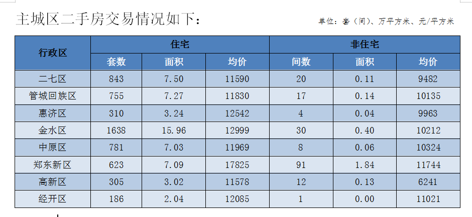 郑州全市二手房共成交7282套(间),成交面积74.45万平方米,成交均价11187元/平方米;其中住宅二手房共成交7057套,成交面积71.22万平方米,成交均价11211元/平方米。(备注:二手房均价是以评估指导价为计算依据)