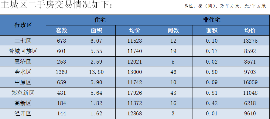 郑州全市二手房共成交5752套(间),成交面积59万平方米,成交均价11272元/平方米;其中住宅二手房共成交5573套,成交面积56.38万平方米,成交均价11360元/平方米。(备注:二手房均价是以评估指导价为计算依据)