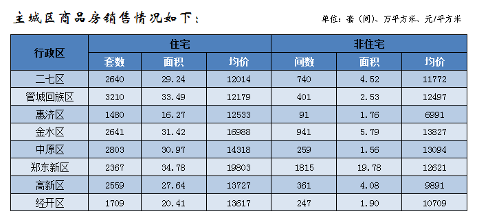 郑州全市商品房销售39987套(间),销售面积438.47万平方米,销售均价11767元/平方米;其中商品住宅销售32088套,销售面积372.3万平方米,销售均价12016元/平方米。非住宅销售7899套(间),非住宅销售面积66.17万平方米,非住宅销售均价为10361元/平方米。