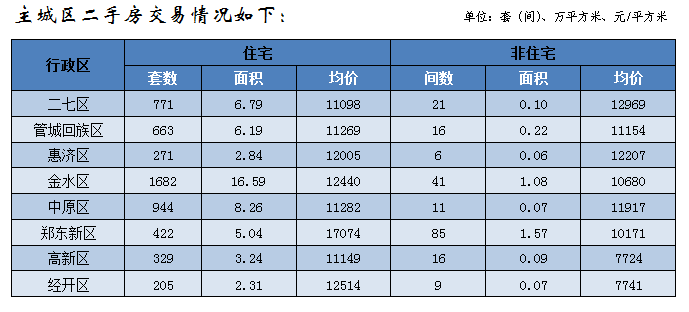 郑州全市二手房共成交7217套(间),成交面积74.22万平方米,成交均价10622元/平方米;其中住宅二手房共成交6981套,成交面积70.26万平方米,成交均价10681元/平方米。(备注:二手房均价是以评估指导价为计算依据)